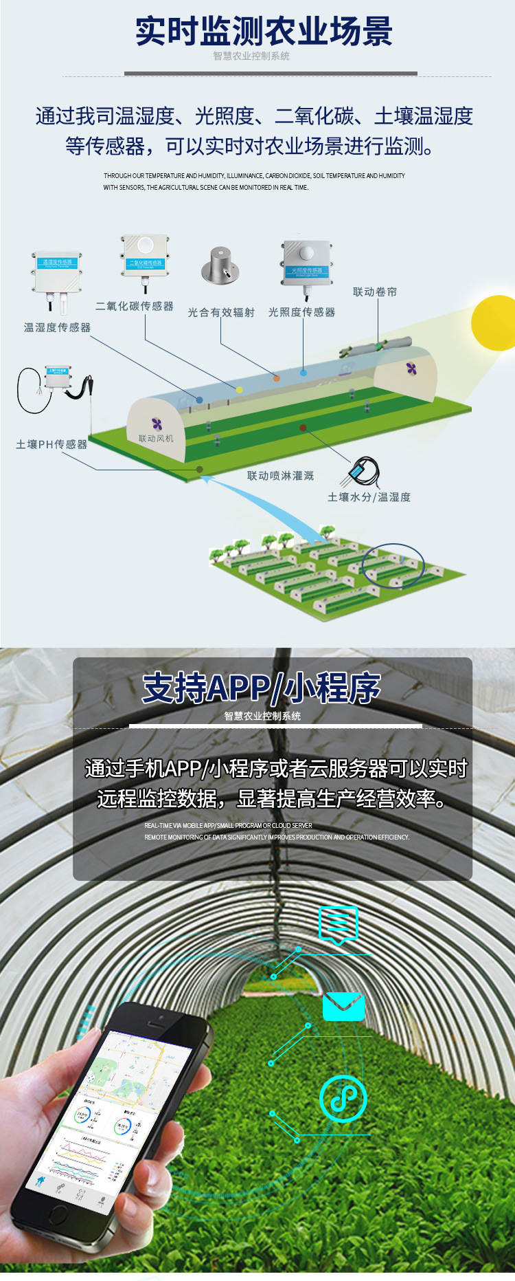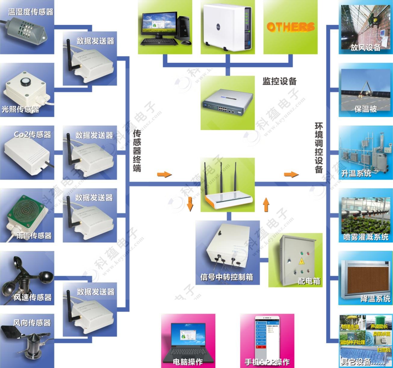 依托傳感器終端如溫度濕度傳感器、光照傳感器、土壤溫濕度、CO2傳感器、雨雪傳感器、風(fēng)速傳感器、風(fēng)向傳感器等,將信息采集發(fā)送到信號采集系統(tǒng),信號采集系統(tǒng)再通過云發(fā)送信息到電腦、手機(jī)端,通過電腦、手機(jī)端就可以直接對各環(huán)境調(diào)控設(shè)備如通風(fēng)系統(tǒng)、遮陽保暖系統(tǒng)、升溫系統(tǒng)、降溫系統(tǒng)、噴霧灌溉系統(tǒng)、降濕系統(tǒng)或其它設(shè)備等進(jìn)行調(diào)控。