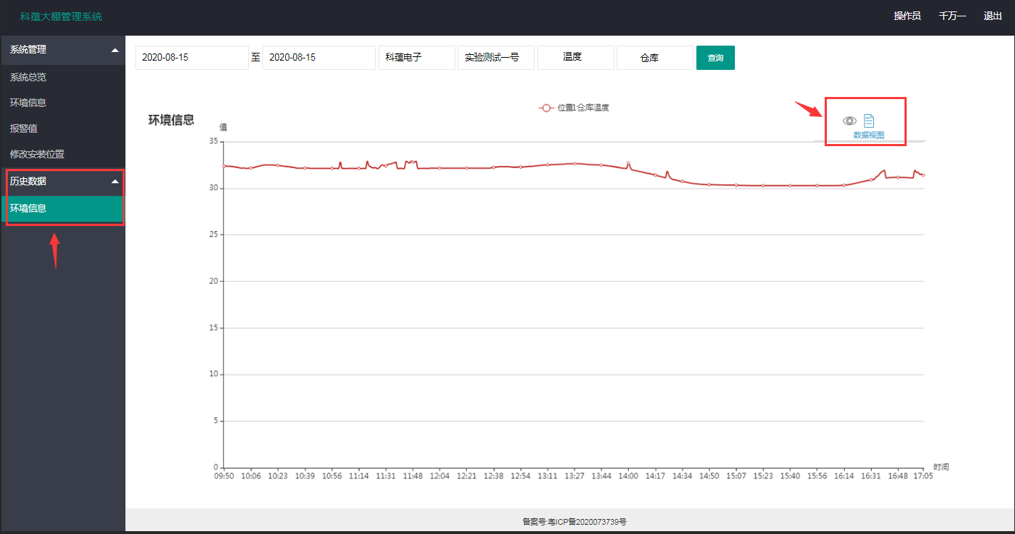 點(diǎn)擊“歷史數(shù)據(jù)”選擇下拉選項(xiàng)的“環(huán)境信息”,根據(jù)您要查詢的參數(shù)查詢會(huì)顯示如下曲線圖,若您需下載數(shù)據(jù),請(qǐng)點(diǎn)擊右側(cè)紅框所示中的眼睛圖案;若想要數(shù)據(jù)查看,請(qǐng)點(diǎn)擊旁邊的文件圖案(鼠標(biāo)移至?xí)刑崾荆?nbsp;